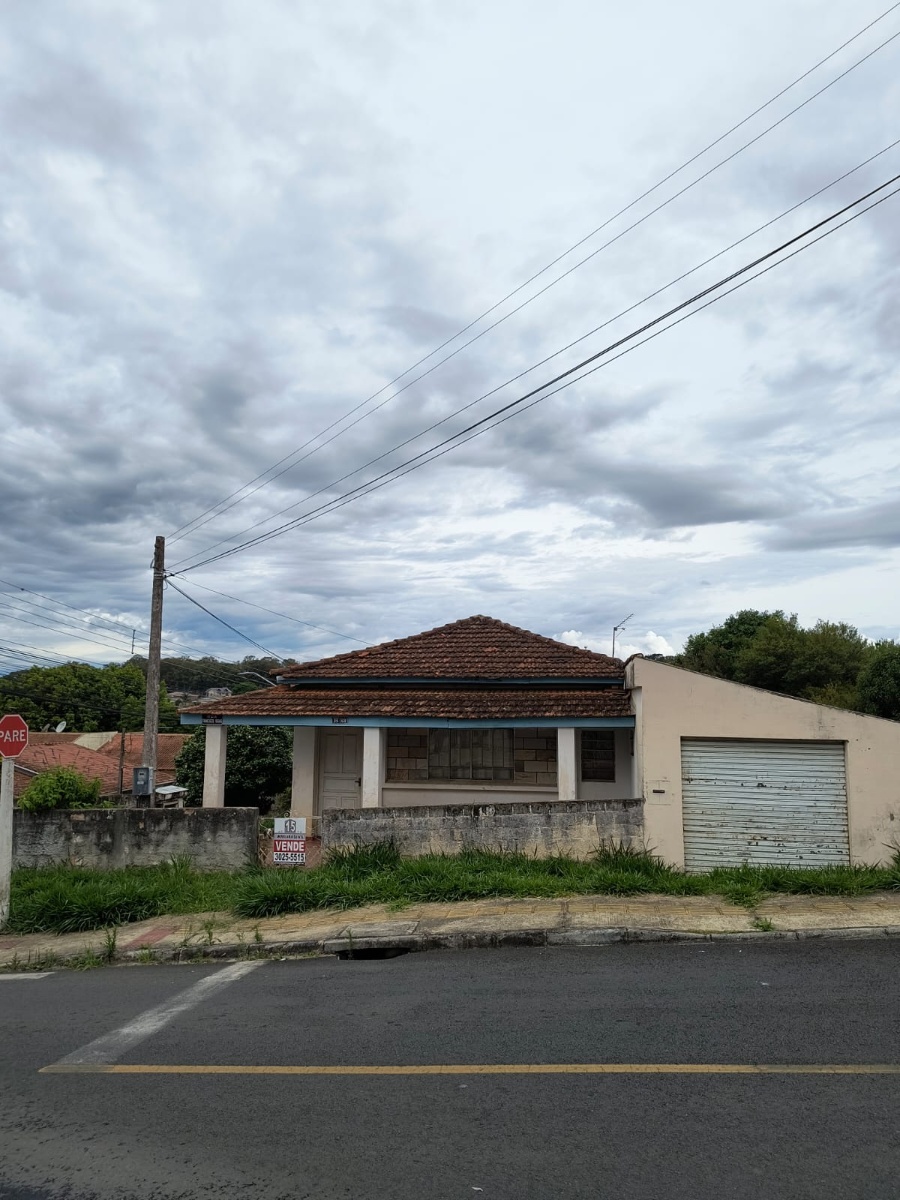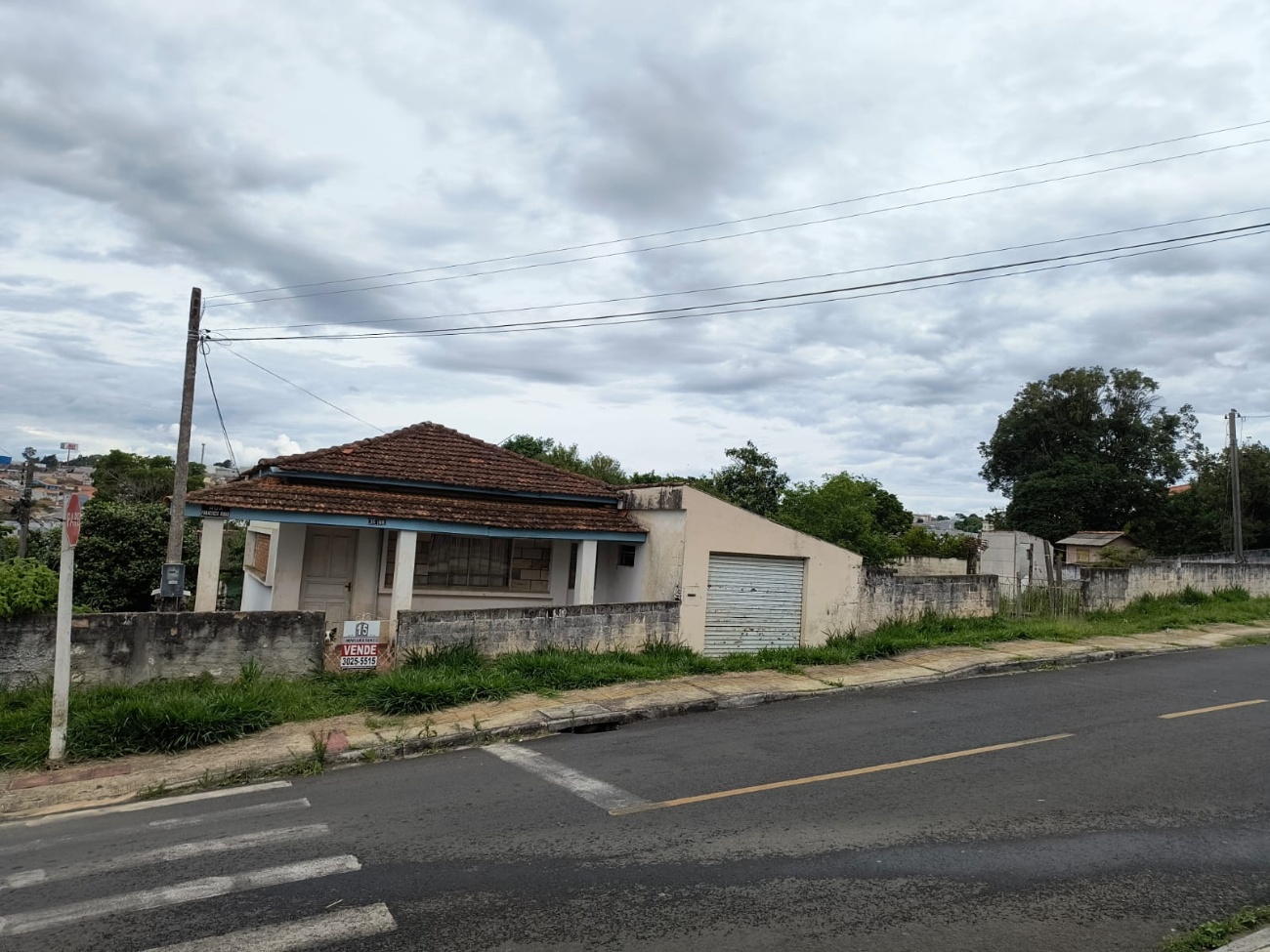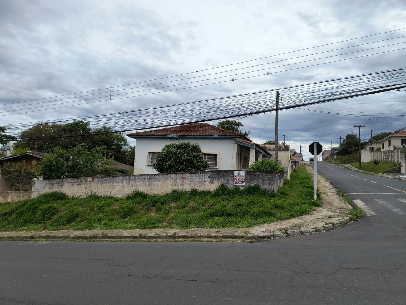 Um amplo lote de terreno de esquina plano contendo uma residência em alvenaria.